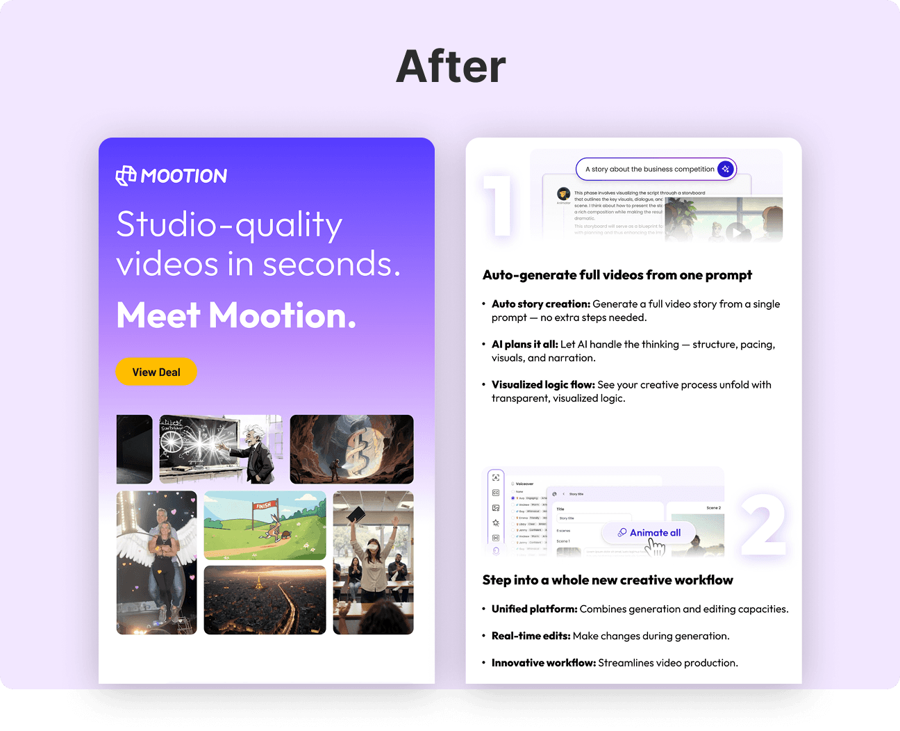 The first dedicated email campaign for Mootion resulted in a XX% increase in click-through rate and an immediate lift in purchases. Dedicated deal emails are now a repeatable strategy contributing to improved engagement and sustained revenue growth.
