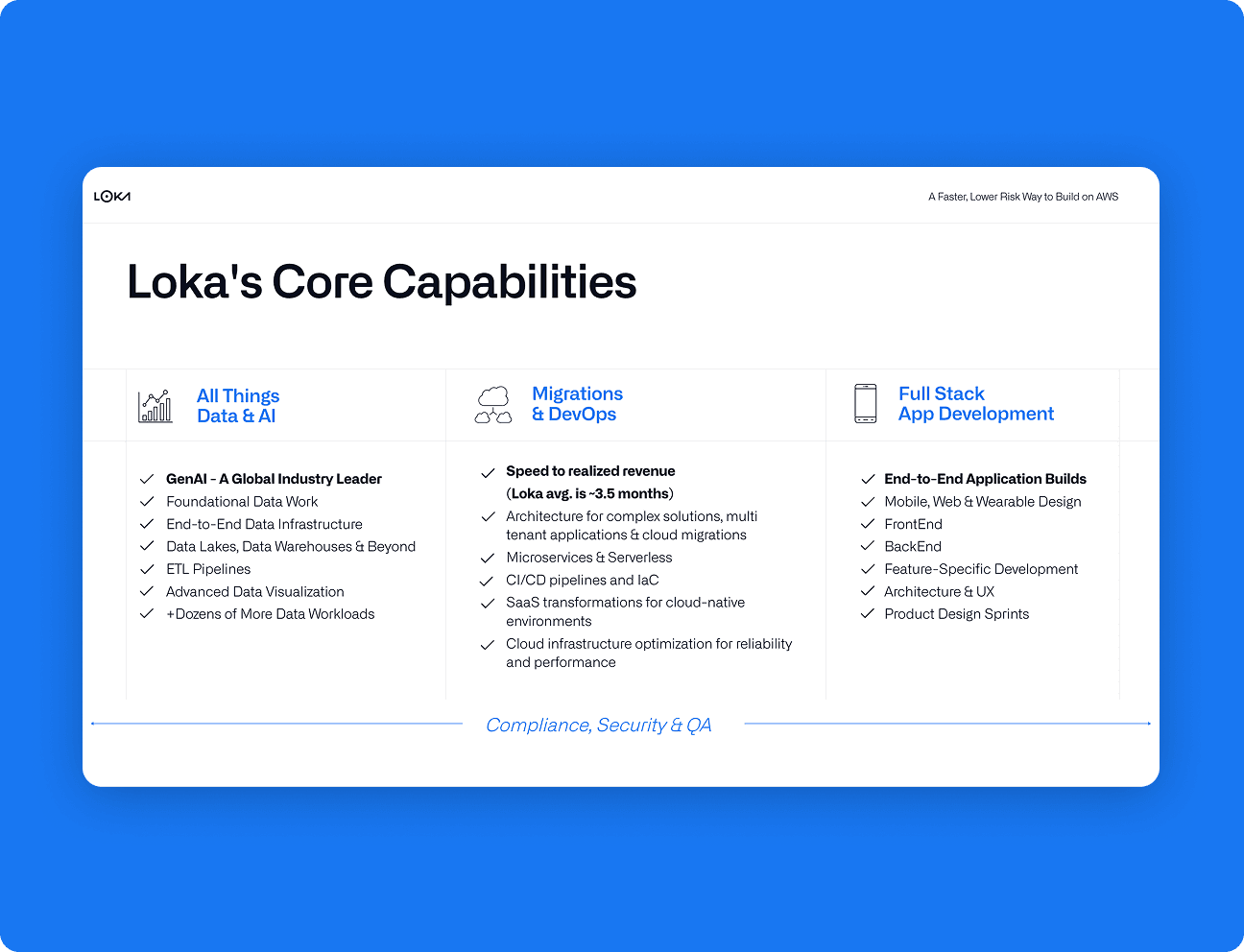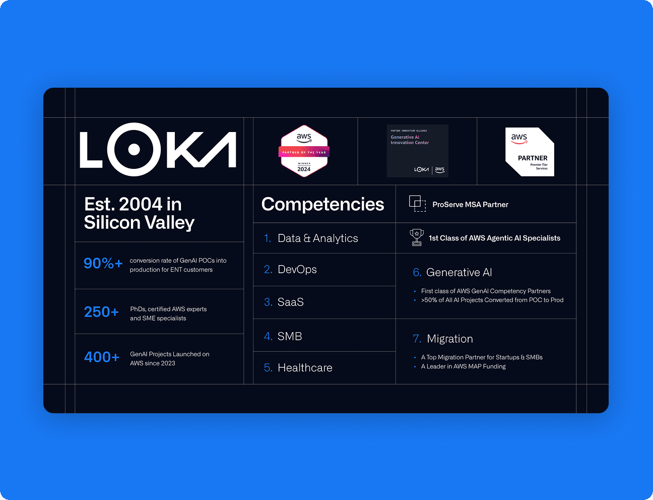 Redesigned LoKA’s core presentation template to support both internal and external use for a high-growth enterprise consultancy. As an AWS Innovation Partner of the Year, LoKA needed a presentation system that reflected their credibility when presenting to companies like Intel and Amazon.