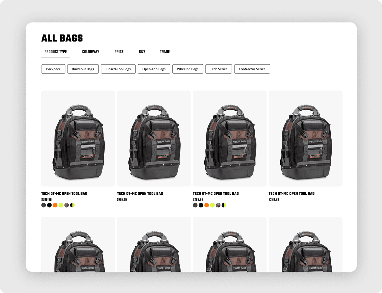 Product pages were redesigned with consistent photography to highlight each bag’s unique features, functionality, and real-world scale.